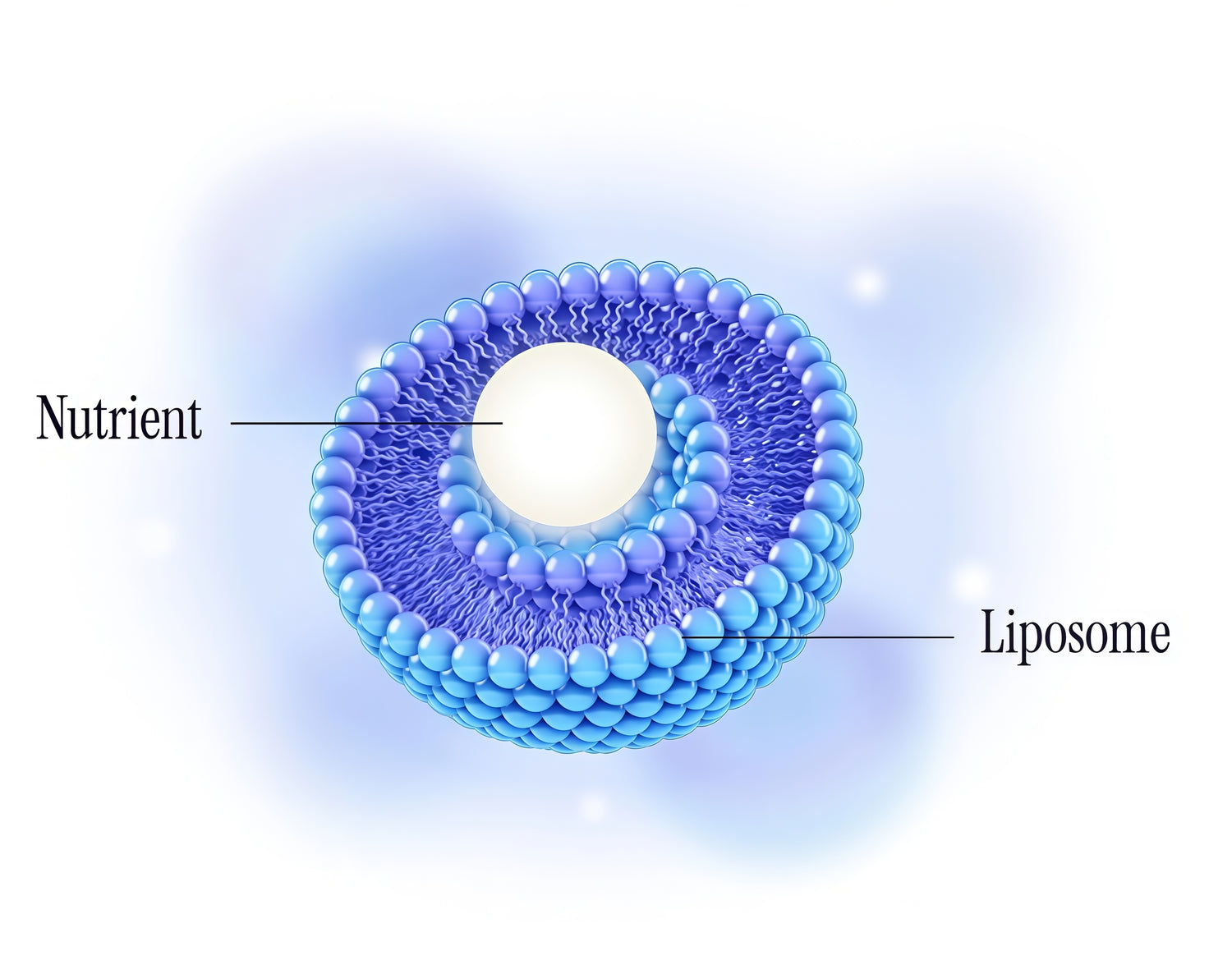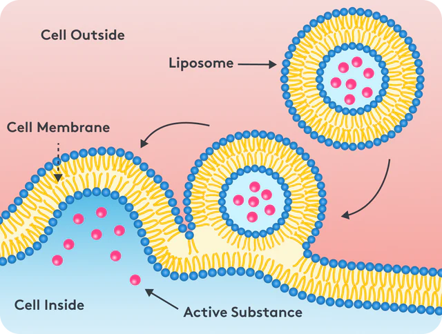 Nutrients are enclosed within liposomes—tiny, lipid-based spheres designed to protect active ingredients.