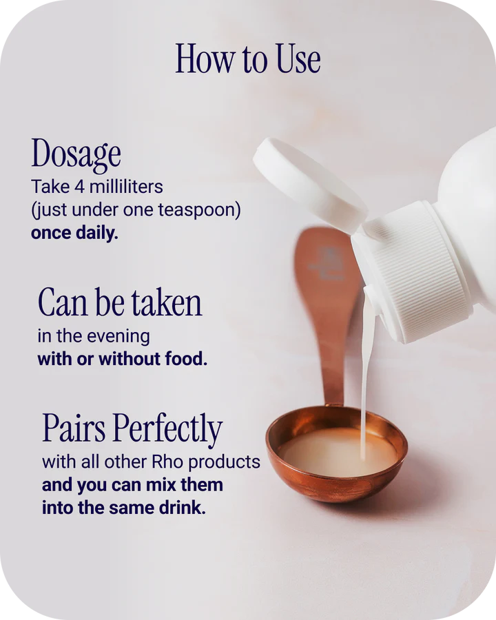 I take a teaspoon of Rho Curcumin + Resveratrol in the afternoon to help support a healthy inflammation response, improve my immune system and support healthy aging on a cellular level.